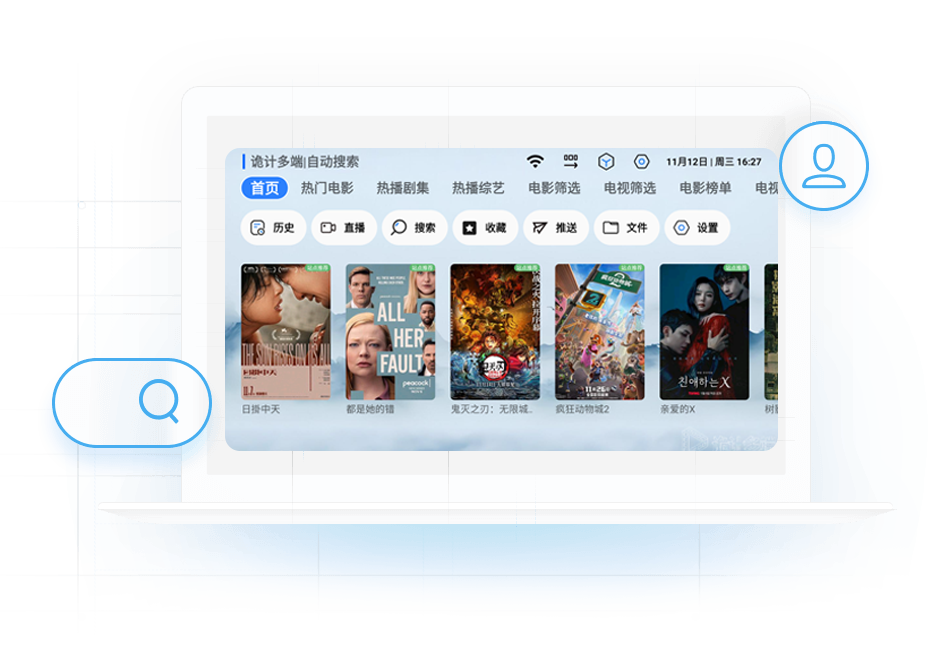 诡计多端 内置丰富影视接口,可以一站式聚合目标资源的全部分类,自动关联展示相关影视内容,同步覆盖直播节目与 EPG 节目预告,全方位满足您的家庭多元观影需求。